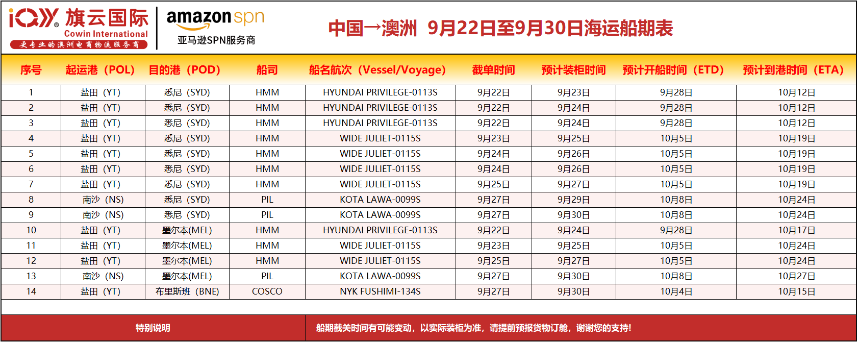 旗云国际-澳洲专线:2025年9月22日-9月30日装柜计划:
